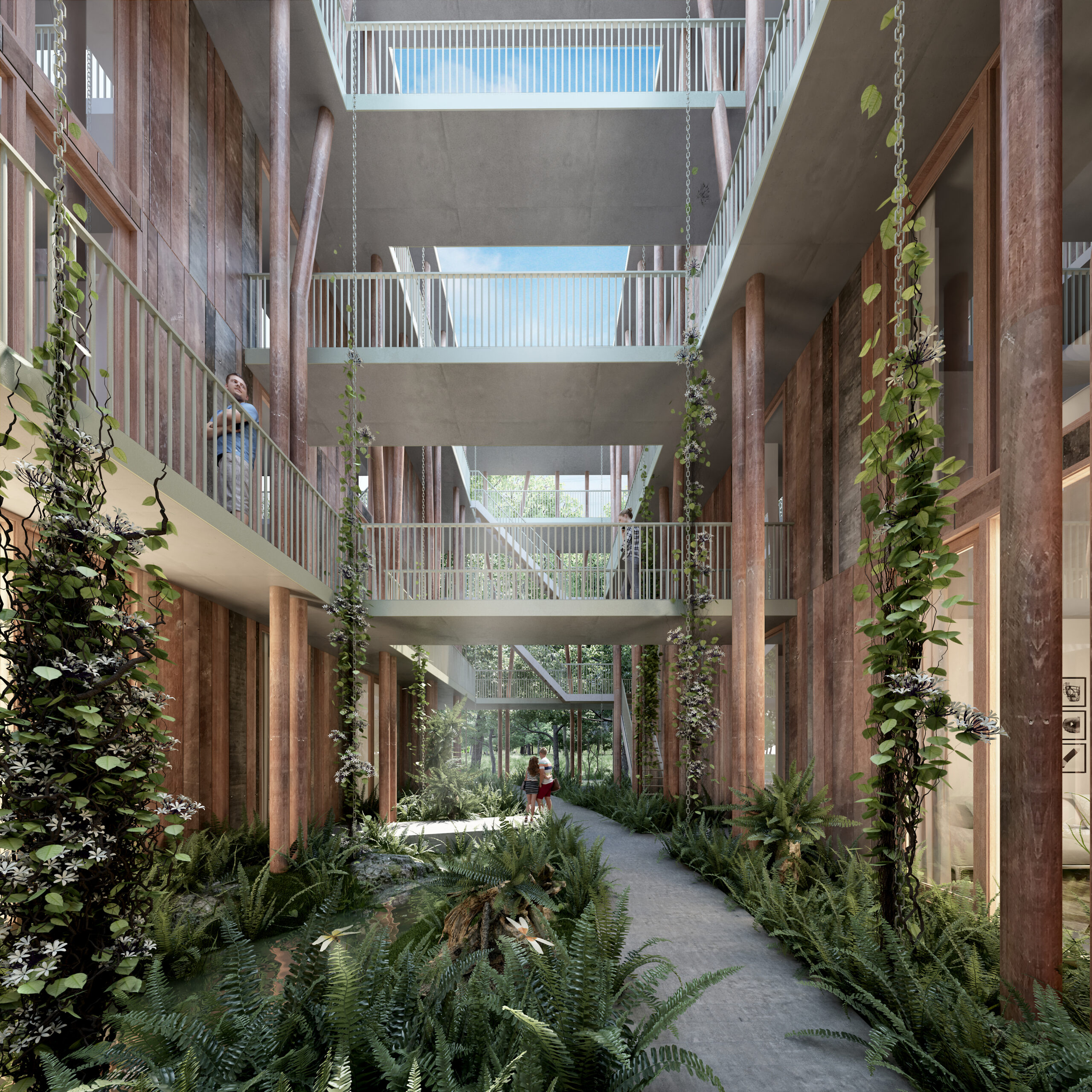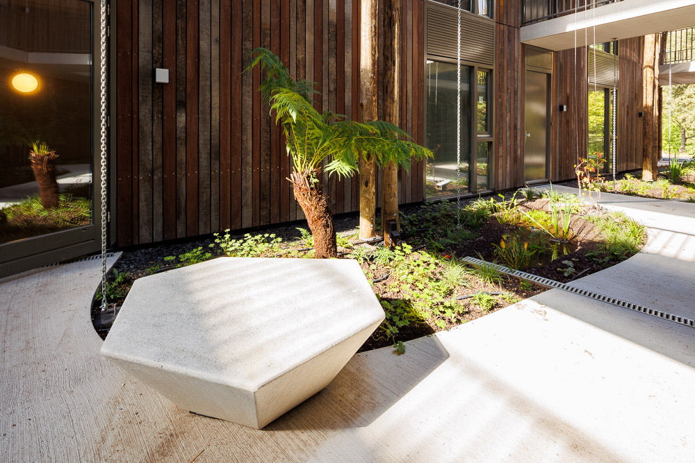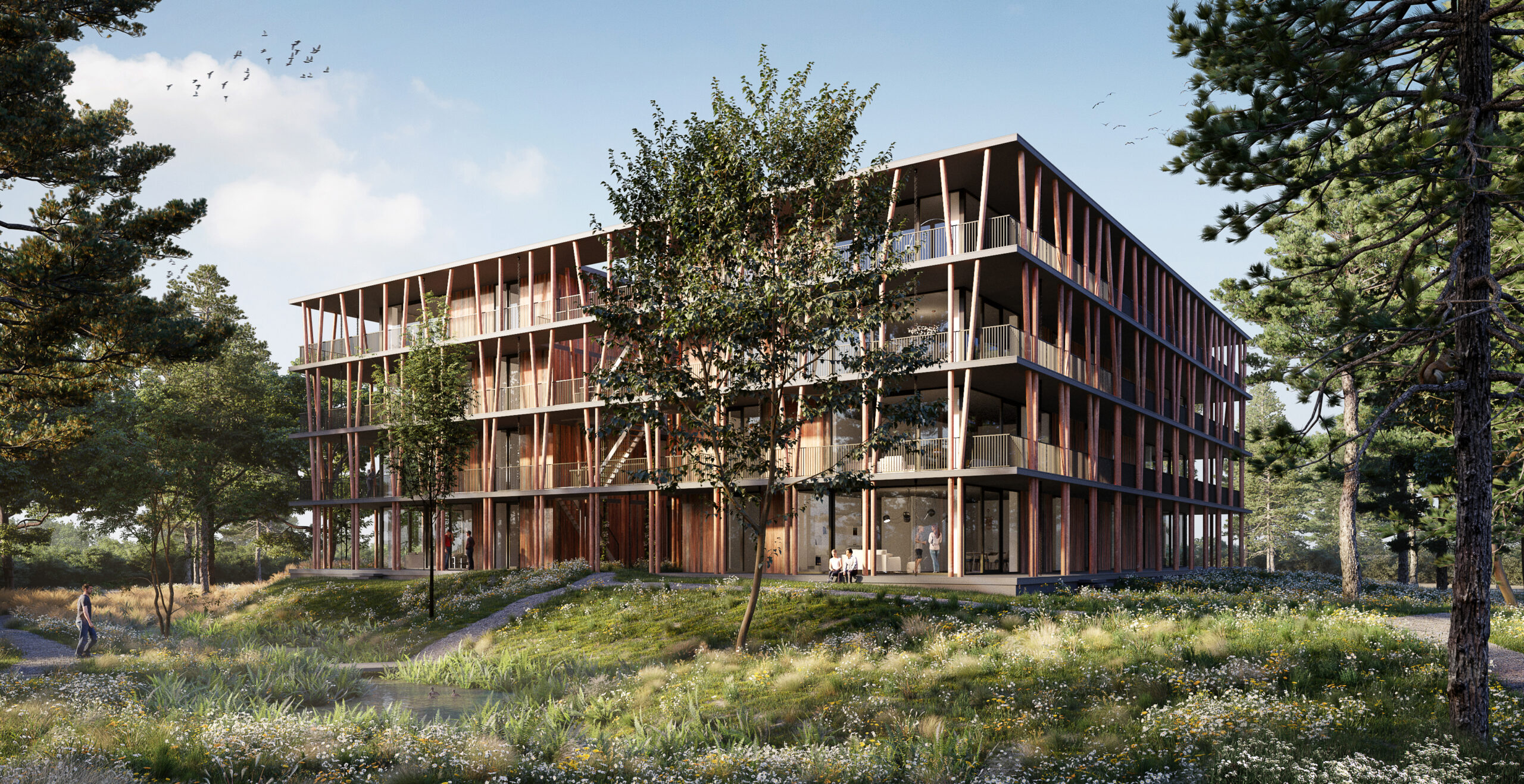 De houten gevel geeft het gebouw een vriendelijke uitstraling met een herkenbare identiteit die past bij de lommerrijke omgeving. Het beeld van de boomstam-kolommen raakt vervlochten met het beeld van de bomen in het park. Als een bospad voert een groene passage dwars door het gebouw heen. Deze intensieve patiodaktuin, ontworpen door MAAK space en aangelegd door Jonkers, brengt de sfeervolle groene omgeving tot in het gebouw zodat bewoners en bezoekers ook in het gebouw de natuur ervaren.