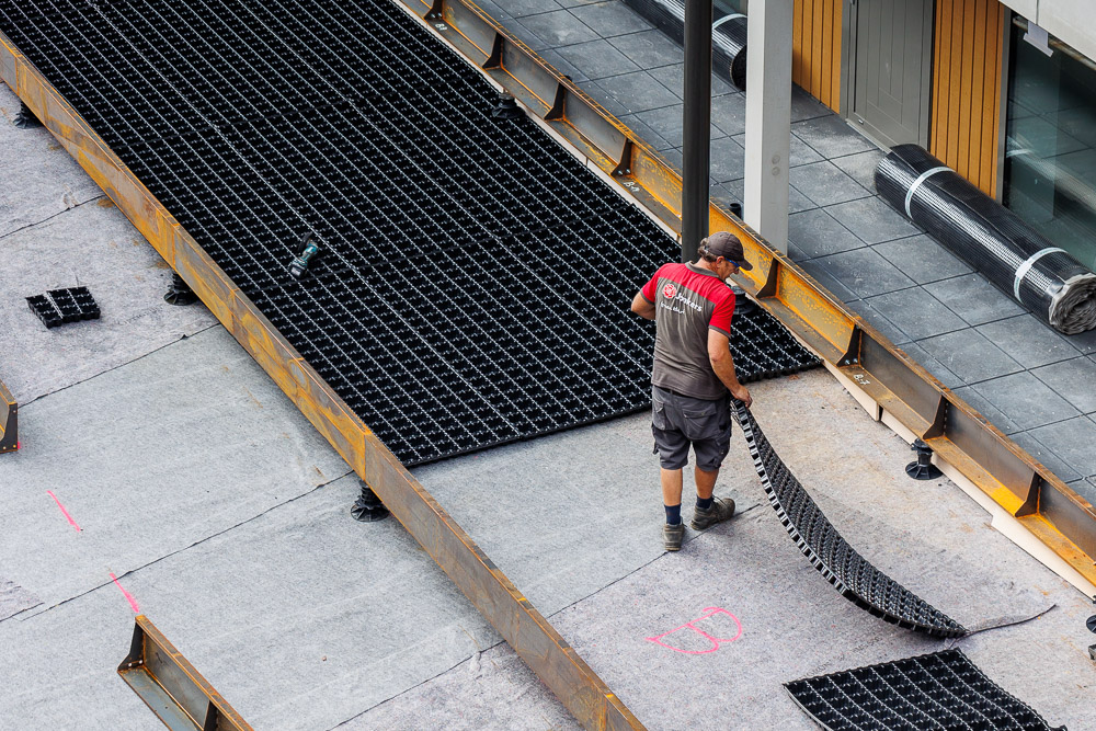 De looppaden welke intensief gebruikt worden, zijn uitgevoerd in betontegel op verstelbare tegeldragers. Hiermee kunnen we de tegels exact stellen op de gewenste hoogte conform bouwbesluit. De centrale paden, welke gebruikt worden wanneer men van de daktuin wil genieten, bestaat uit halfverharding van split. Het split ligt in rasters, zodat de paden ook voor minder validen goed toegankelijk zijn.